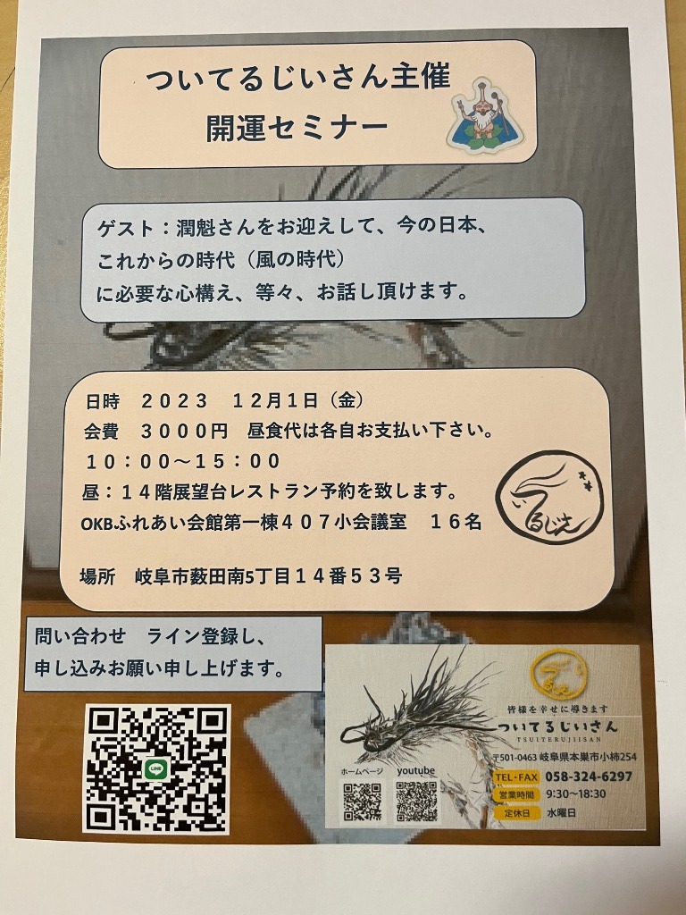 通年イベントが盛りだくさん! 通年イベントが盛りだくさん! カードリーディング あなたの定められた運命をたどり、これから進むべき道を明らかにしていくリーディングです。外部の講師をお招きし、専門性の高いカードリーディングを受けていただく事も可能です。日本の神様カード、龍神カード、竜宮(百目サイコロ)、ペンデュラムの4種類有ります。この4種類から直感であなたが選択していただき、悩みなど、メッセージを受け取ります。 ヴァイオリン教室 “ついてるじいさん”オーナーの川瀬は、8年ほどヴァイオリン教室に通った経験があり、腕には自信ありです!初めて楽器に触れる方も、お気軽に体験していただけます。 粘土工作体験 20年以上、粘土工作を行っていて、代表作「日本の神様カードクレイモデル」をはじめ、様々な作品を作ってきました!粘土はストレス解消にもなり、大人になってもとても楽しめるので、ぜひ体験してみてください。使用粘土:石紛ねんど(日本製)写真は、完成品、高さ500m、色塗りは、無のタイプです。 糸掛け体験 糸掛け工作では、曼荼羅のような模様など、様々な作品を作ることが可能です。画家であり、様々な分野の作品を手掛ける川瀬愛子が、糸掛け工作をお教えします。興味を持っていただけましたら、お気軽にお問い合わせください!写真は、完成品。サイズ、300mm×300mm専用台付き。 ついてるじいさん主催イベントのお知らせ 2023 12月1日場所 OKBふれあい会館第1棟407小会議室 16名イベント時間10時~15時 会費3000円潤魁さんをお招きしてこれからの日本(風の時代)等、お話して頂けます。お楽しみ下さい。